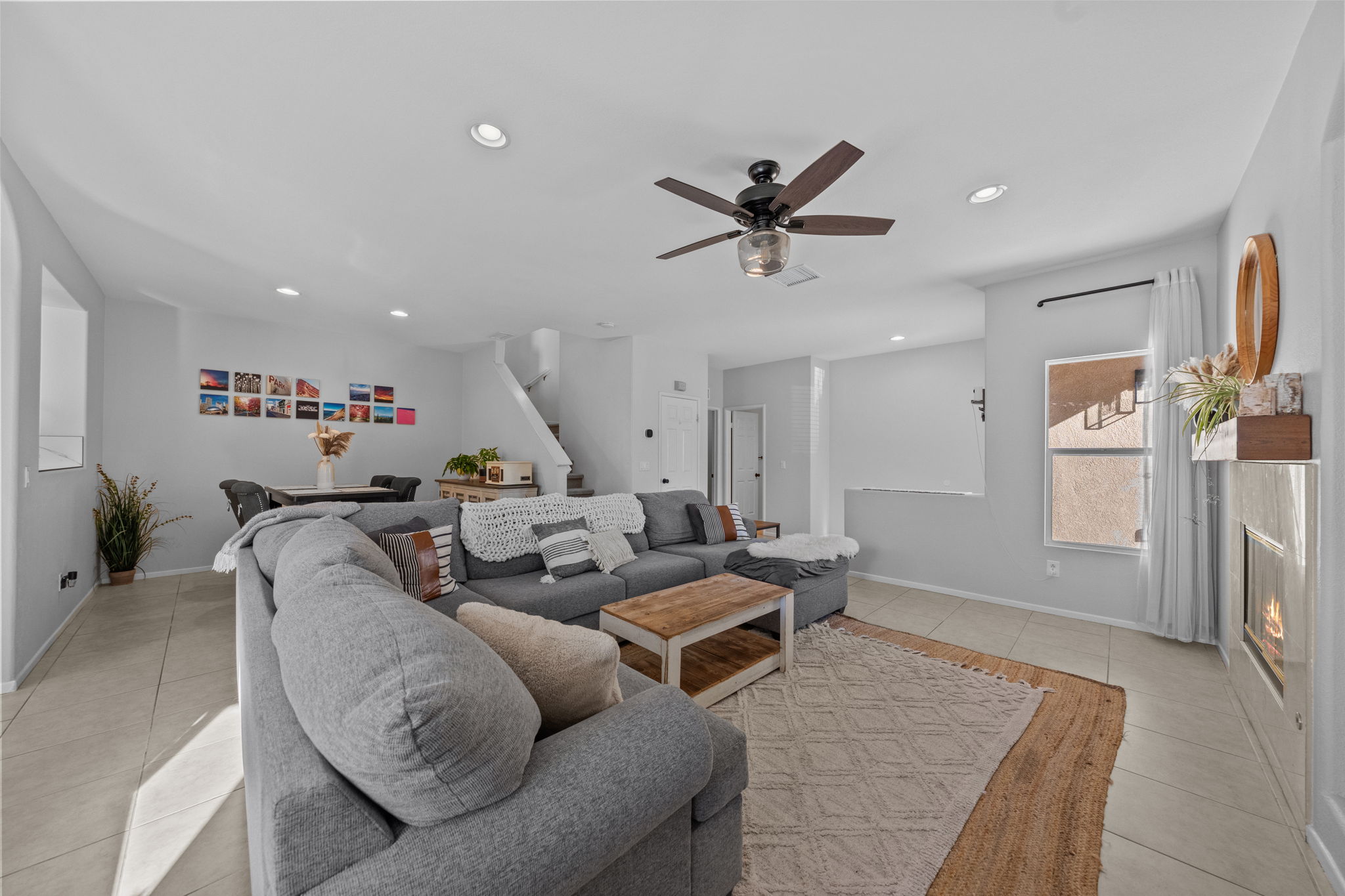 throughout the home include new A/C, a recently replaced furnace, ceiling fans in all rooms, gas fireplace, and an included washer and dryer. Flooring features